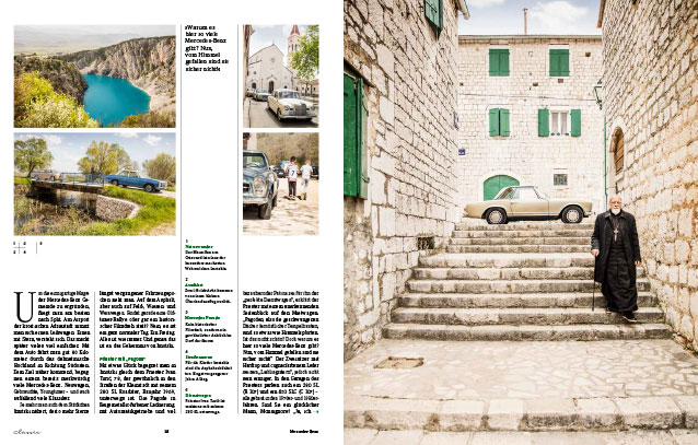 Mit etwas Glück begegnet man in Imotski gleich dem Priester Ivan Turić, 78, der gewöhnlich in den Straßen der Kleinstadt mit seinem 280 SL Roadster, Baujahr 1969, unterwegs ist. Die Pagode in Beigemetallic-farbener Lackierung, mit Automatikgetriebe und viel bezaubernder Patina sei für ihn der „perfekte Dienstwagen“, erklärt der Priester mit einem anerkennenden Seitenblick auf den Mietwagen: „Pagoden, also die geschwungenen Dächer fernöstlicher Tempelbauten, sind so etwas wie Himmelspforten. Ist das nicht schön? Doch warum es hier so viele Mercedes-Benz gibt?
