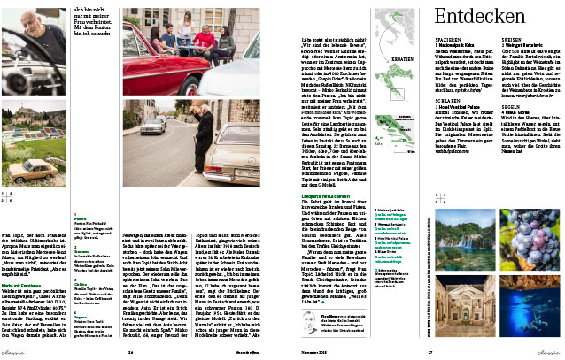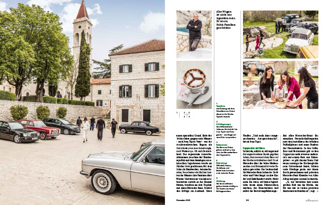 Welcher ist sein ganz persönlicher Lieblingswagen? „Unser Astralsilbermetallic-farbener 240 D 3.0, Baujahr 1974, fünf Zylinder, 80 PS.“ Zu ihm habe er eine besonders emotionale Bindung, erklärt er. Sein Vater, der auf Baustellen in Deutschland schuftete, habe sich den Wagen damals gekauft. Als Neuwagen, mit einem Kredit finanziert und in zwei Jahren abbezahlt. Sechs Jahre später sei der Vater gestorben – doch habe den Wagen vorher seinem Sohn vermacht. Und auch Ivan Topić hat den Strich-Acht bereits jetzt seinem Sohn Mile versprochen. Der wiederum solle ihn später seinem Sohn vererben. Das sei der Plan. „Das ist das ungeschriebene Gesetz unserer Familie“, sagt Mile schmunzelnd. „Denn der Wagen ist nicht einfach nur irgendein Auto. Er ist ein Stück Familiengeschichte. Aber keins, das traurig in der Garage steht. Wir fahren viel mit dem Auto herum. Es macht einfach Spaß.“ Mirko Perkušić, 68, enger Freund der Topićs und selbst auch Mercedes Enthusiast, ging wie viele seines Alters im Jahr 1968 nach Deutschland, erzählt er. Als Maler. Damals war er 18. Er arbeitete in Karlsruhe, später in der Schweiz. Erst vor drei Jahren ist er wieder nach Imotski zurückgekehrt. „Ich bin in meinem Leben immer nur Mercedes gefahren, 27 habe ich insgesamt besessen“, sagt der Rückkehrer. Der erste, den er damals als junger Mann in Deutschland erwarb, war ein schwarzer Ponton 180 D, Baujahr 1956. Heute fährt er das gleiche Modell. „Zurück zu den Wurzeln“, erklärt er.